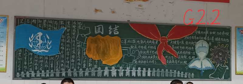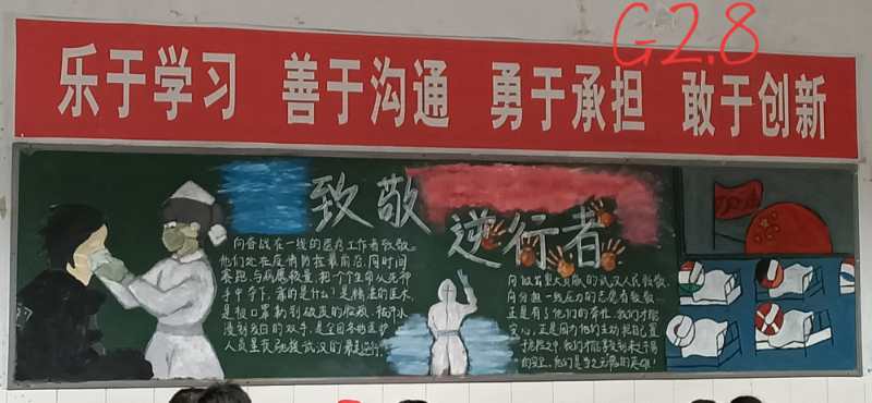 黑板報是學校宣傳的陣地,對學生進行教育的媒體。為提高師生疫情防控能力,宣傳防疫知識,我校開展了黑板報設(shè)計活動?;顒又?,各班教師緊扣防“疫”主題,廣泛搜集材料,針對孩子的認知水平,選取趣味性、知識性的內(nèi)容。再加以繪畫,修飾等,一幅幅圖文并茂、主題鮮明、形式新穎的板報作品呈現(xiàn)出來。在板報內(nèi)容選擇上,有抗疫英雄人物的介紹,讓抗疫成為教材,培養(yǎng)學生從小對英雄的崇敬,樹立正確的人生觀、價值觀;有七步洗手法、正確戴口罩的圖解,提高師生的防疫技能,養(yǎng)成健康生活方式;有心理健康教育,舒緩學生居家隔離導致的情緒焦慮,保障學生身心健康。通過活動,抗“疫”板報作品成為校園一道靚麗的風景線,走進教室就有全新的感受。讓學生足不出室就能系統(tǒng)的了解學習防疫知識,讓黑板報成為戰(zhàn)“疫”小陣地。